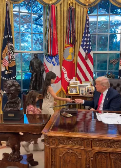 كما قدم ترامب للأطفال "عملات التحدي" التذكارية، وأنهى اللقاء بتقديم أقلام من مكتبه قائلًا: "هل تريدون قلمًا؟"، وفق مصادر في البيت الأبيض، موضحة أن الأطفال كانوا ضمن جولة قصيرة للسلام على الرئيس.