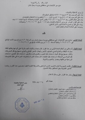 أصدر وزير الداخلية والبلديات أحمد الحجار، قراراً بمنع سير الشاحنات في محافظتي بيروت وجبل لبنان اعتباراً من الساعة 8:30 صباح يوم الأحد في 30/11/2025 ولغاية الساعة 21:30 من يوم الثلاثاء في 2/12/2025، بمناسبة زيارة البابا لاوون الرابع عشر.