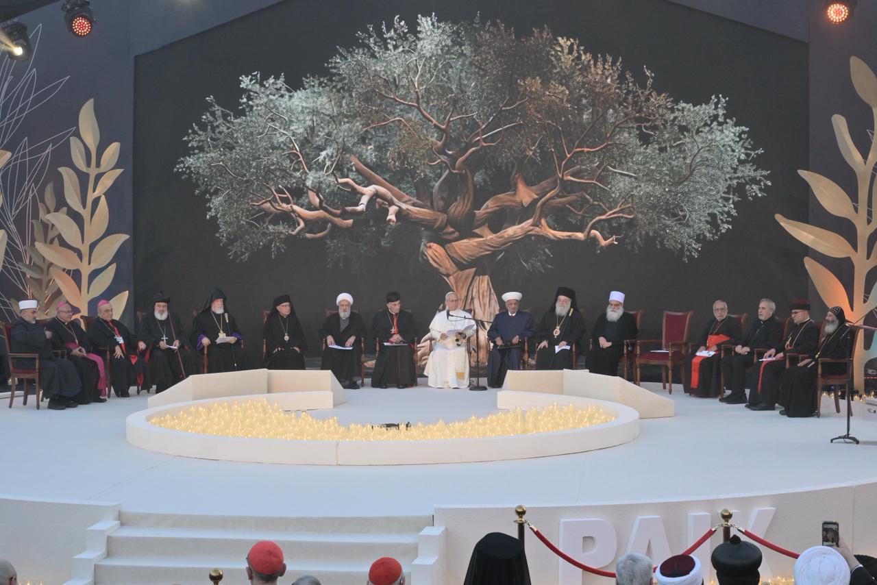 ولدى دخول قداسة البابا علا التصفيق في القاعة واعتلى البابا المنصة وصافح رؤساء الطوائف الذين سيشاركوه في اللقاء على وقع هتاف ليحيا البابا.