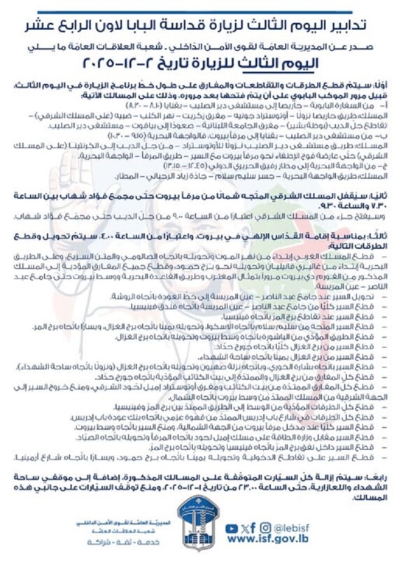 أعلنت المديرية العامّة لقوى الأمن الدّاخلي ـ شعبة العلاقات العامّة في بيان، بانها تذكّر بتدابير سير اليوم الثالث لزيارة قداسة البابا لاون الرابع عشر لبنان بتاريخ 2-12-2025: