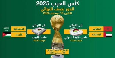 وتقام المباراة النهائية لبطولة كأس العرب قطر 2025، التي تستضيفها قطر حاليا وتستمر حتى 18 من ديسمبر الجاري، يوم الخميس المقبل، وتنطلق في الساعة السابعة مساء بتوقيت الدوحة على ملعب لوسيل.