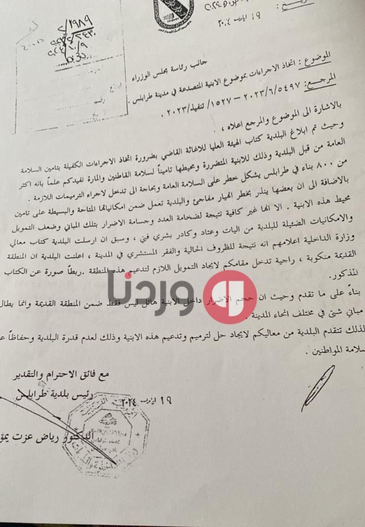 الكتاب الرسمي الذي أبلغت من خلاله الحكومة بحال الأبنية في طرابلس 2024