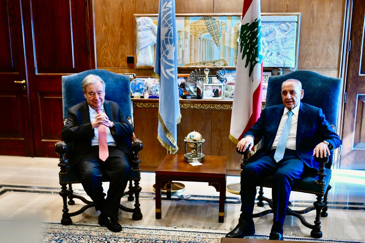 ومن بعبدا، انتقل غوتيريش والوفد المرافق الى عين التينة للقاء رئيس مجلس النواب نبيه بري حيث تناول اللقاء تطورات الأوضاع العامة في لبنان والمنطقة والمستجدات السياسية والميدانية على ضوء تصاعد العدوان الإسرائيلي على لبنان وتداعياته على كافة المستويات لا سيما ملف النزوح وتهجير مئات آلاف اللبنانيين قسراً عن منازلهم إضافة لدور قوات اليونيفيل وما تتعرض له من إعتداءات إسرائيلية .