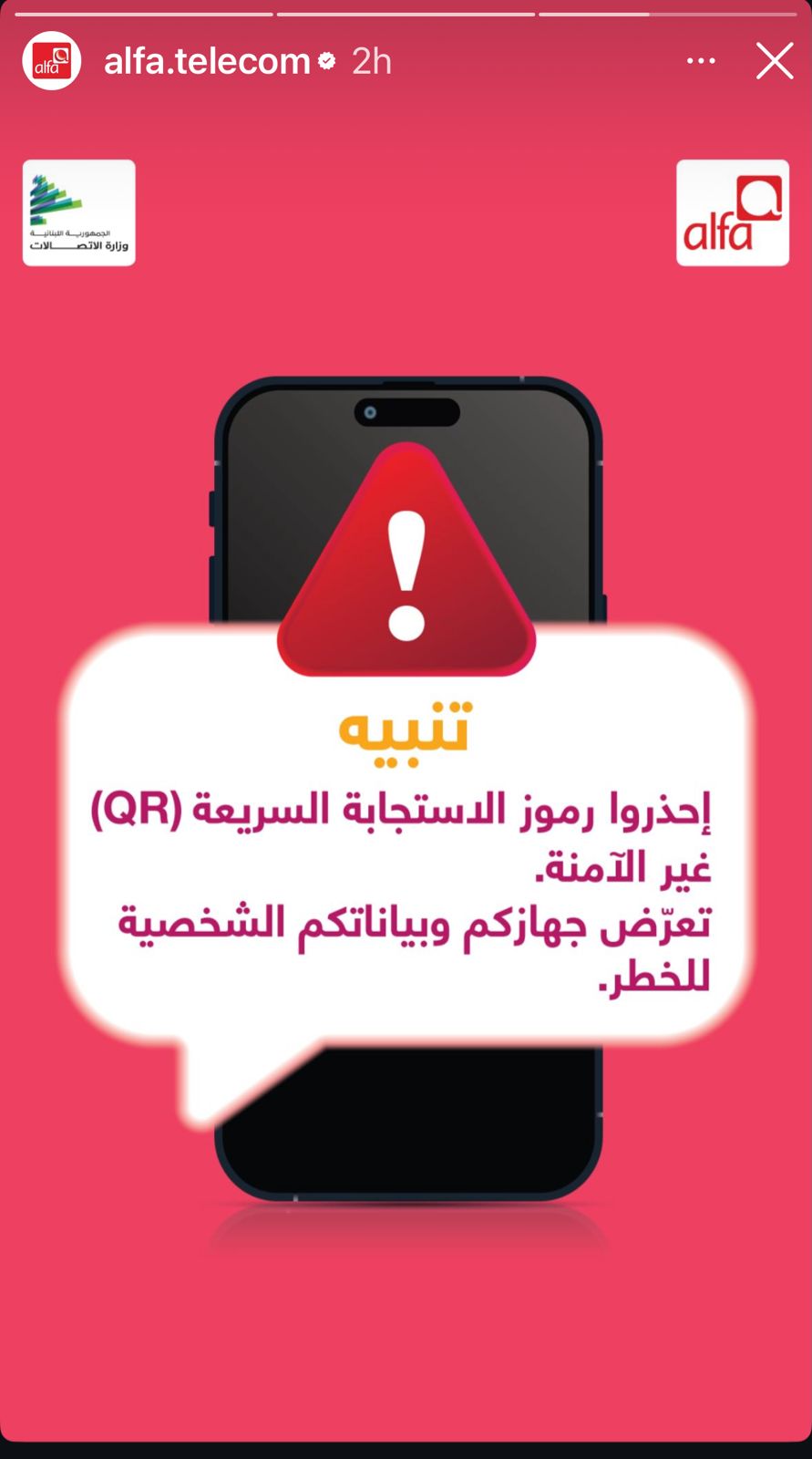 كان لافتا التحذير الذي نشرته شركة ألفا على صفحاتها على مواقع التواصل داعية فيه مشتركيها الى عدم التفاعل مع رموز الQR Code غير الأمنة، تفاديا لتعريض أجهزتهم وبياناتهم لخطر الاختراق.