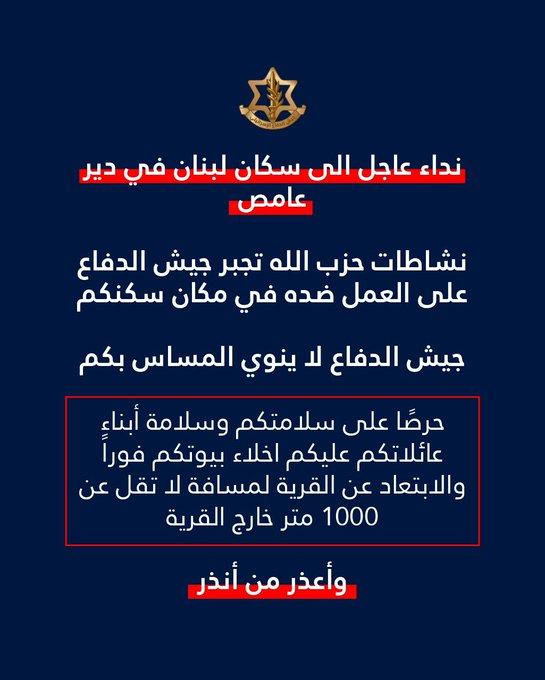 إلى ذلك، وجه المتحدث باسم الجيش الاسرائيلي أفيخاي أدرعي إنذارا عاجلا الى سكان لبنان المتواجدين في بلدة دير عامص وكتب عبر حسابه على "أكس". "نشاطات حزب الله الأرهابية وقيامه بعمليات الإطلاق من بلدتكم تجبر جيش الدفاع على العمل ضده في مكان سكنكم. جيش الدفاع لا ينوي المساس بكم. حرصًا على سلامتكم وسلامة أبناء عائلاتكم عليكم اخلاء بيوتكم فوراً والابتعاد عن القرية لمسافة لا تقل عن 1000 متر خارج القرية”.