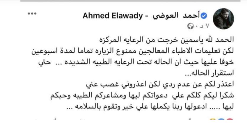 طمأن الفنان أحمد العوضي، جمهور زوجته الفنانة ياسمين عبدالعزيز، عن حالتها الصحية، وقال في «فيس بوك»: «الحمد لله ياسمين خرجت من الرعاية المركزة، لكن تعليمات الأطباء المعالجين إن ممنوع الزيارة تماما لمدة أسبوعين، خوفا عليها، حيث إن الحالة تحت الرعاية الطبية الشديدة حتى استقرار الحالة». وأضاف: «أعتذر لكم عن عدم ردي لكن اعذروني غصب عني، شكرا ليكم كلكم على دعواتكم ليها ومشاعركم الطيبة وحبكم ليها، ادعولها ربنا يكملها على خير وتقوم بالسلامة».