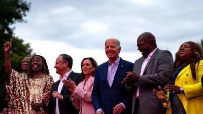وأظهرت اللقطات بايدن مبتسمًا، بينما كانت نائبة الرئيس كامالا هاريس وأفراد عائلة جورج فلويد يرقصون.