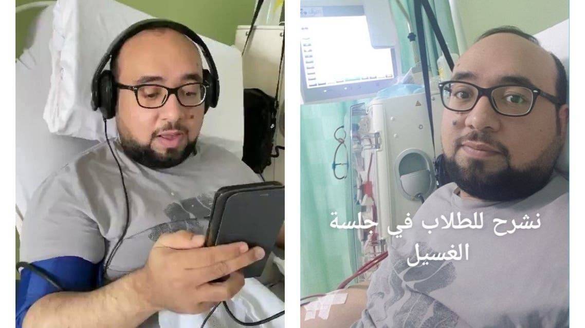 Young Saudi teacher Khalid Akash experienced moments of pain and sorrow as he underwent repeated dialysis sessions while also searching for the possibility of a kidney transplant for over a year. This did not prevent Akash from performing his profession, to which he dedicated his entire life; during his hospital dialysis sessions, he was teaching his students their lessons remotely.
