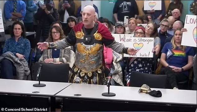 In New Hampshire, an attending parent appeared at a school board meeting wearing a Julius Caesar costume to protest the school's sexual policies. The man, named Michael Guglielmo, addressed the attendees by stating he was "Julius Caesar, and therefore a woman," and questioned if they believed "these absurdities." The protester emphasized the need to "fire the principal and the teacher who recently came to class in women’s clothing." He mentioned that "the duty of the teacher is to work for the children, to teach them the truth, not lies, to tell them facts, not fantasies, to educate them in biology, not social agendas. We pay taxes and deserve to have our children educated for what we pay; this is not about social agendas, whether they are right-wing or left-wing."