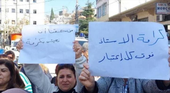 More than two weeks have passed since the strike of public school teachers and their consecutive protests in various regions, with the latest taking place yesterday in front of the Saray in Halba, while the government continues to completely ignore their demands. Dozens of teachers from different categories (vocational, primary, secondary, part-time...) gathered yesterday in front of the Saray in Akkar to demand their rights, with the participation of local leaders and figures who came to support their rightful demands. The teachers carried slogans and banners they made by hand, including messages like: “The dignity of the teacher is above all consideration... We have the right to live with dignity...” expressing the depth of their pain.